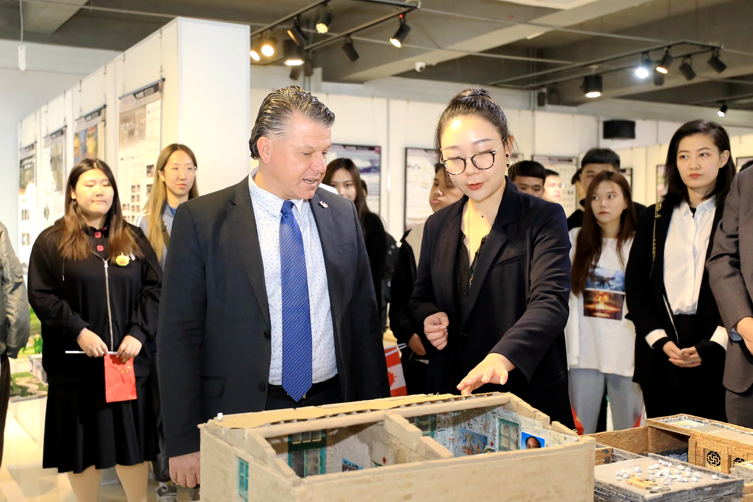 Philip博士和学生热烈互动并参观了艺术作品展。“Wishing the world hope and peace”Philip博士和学校世界青年领导力训练中心的姚墨、纪东辰进行了交流并寄语签名。在艺术展厅,艺术学院珠宝专业学生邀请Philip博士一起进行珠宝创作并向其赠送具有中国元素的珠宝作品。
