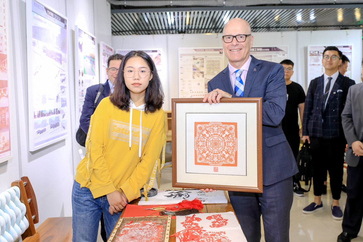 在学校艺术展览馆,校长菲利普·斯廷坎普博士一行参观了艺术学院、信息科学与技术学院有关作品,了解了学生作品的制作过程,参与了学生的剪纸作品创作。现场,菲利普·斯廷坎普博士收到了学生赠送的剪纸作品《健康吉祥》,并对学生精巧的手工和出色的作品设计给予了高度赞赏。
