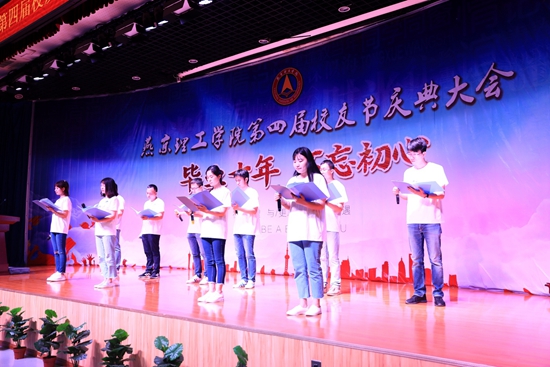 庆典大会现场,十名首届毕业生校友带来诗朗诵《毕业十年不忘初心》,并为老师献上鲜花,表达了对母校深深的眷恋之情和对恩师的感恩之情。为感恩母校,首届校友们还为母校准备了工艺品地球仪作为礼物,寓意“燕理走向世界”,祝愿学校各项事业走向高端化、国际化。