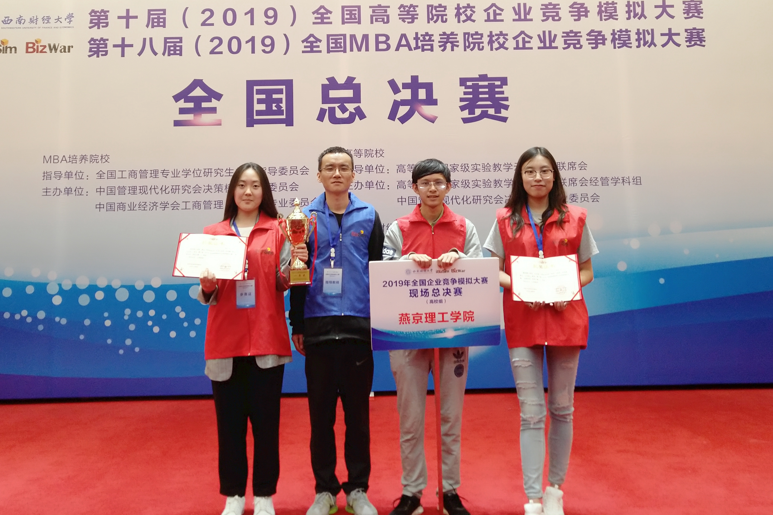 4月27日-28日,由全国工商管理专业学位研究生教育指导委员会指导,高等学校国家级实验教学示范中心联席会经管学科组和中国管理现代化研究会决策模拟专业委员会主办,西南财经大学承办的第十届全国高等院校企业竞争模拟大赛暨第十八届全国MBA培养院校企业竞争模拟大赛总决赛在西南财经大学举行,燕京理工学院参赛学生肖润康、郝山、么天琦在总决赛中荣获全国一等奖。
