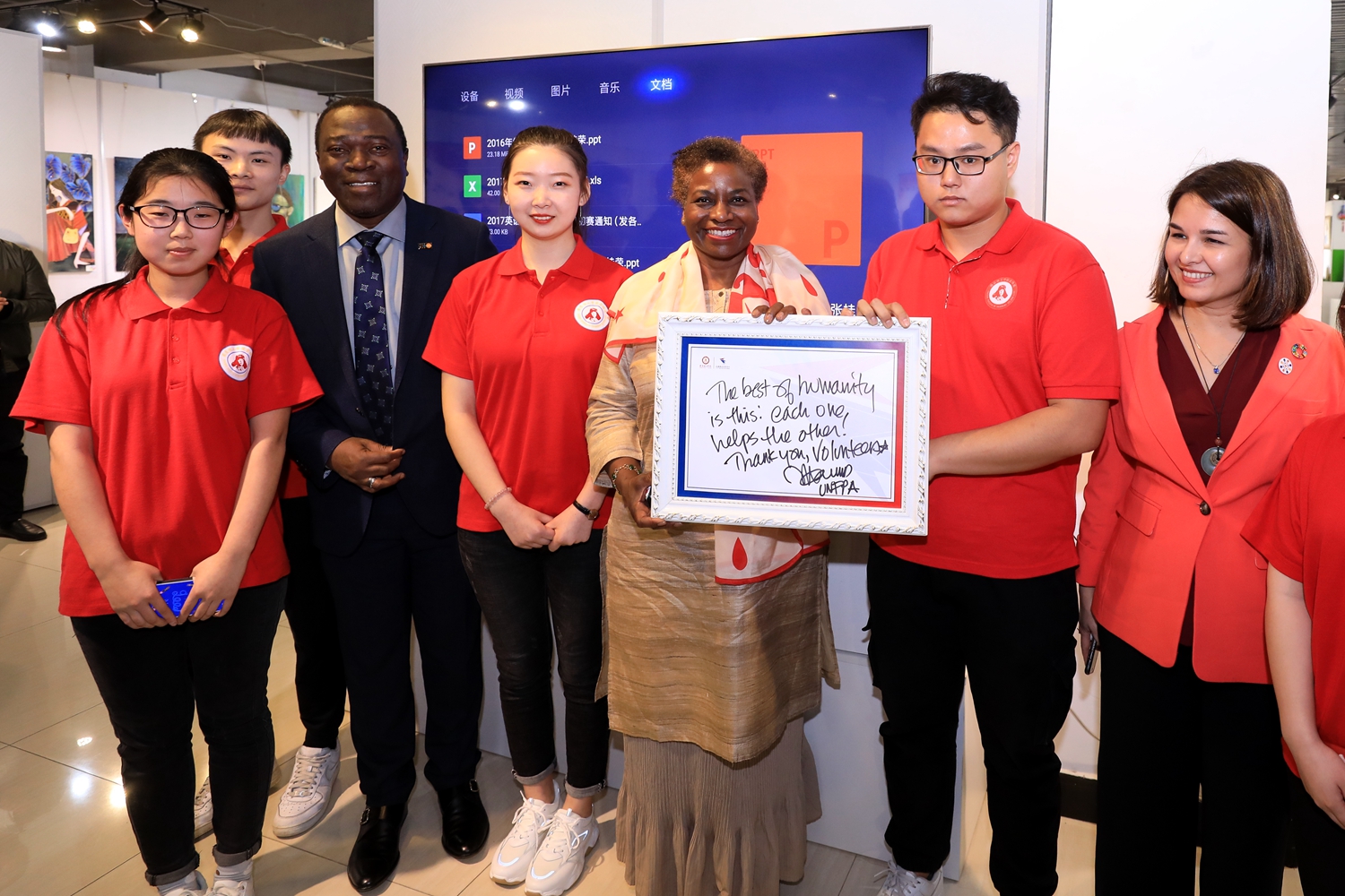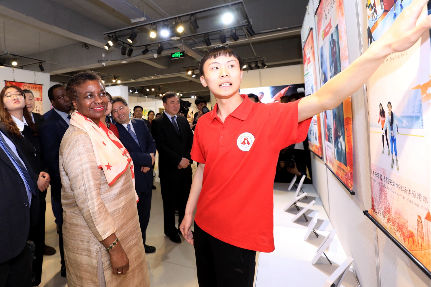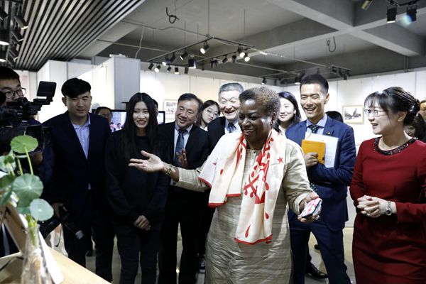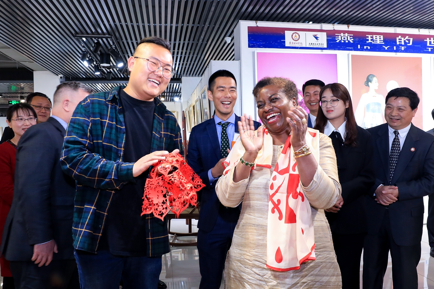 在艺术展厅内,同学们用3D技术打印出了联合国徽章图案,卡内姆博士对此赞不绝口。在摄影作品展区,一幅名为《初心》的作品引起了卡内姆博士的关注,该作品充分展现了新时代女大学生奋发向上的精神风貌,受到了卡内姆博士的赞赏。卡内姆博士还与摄影作品《热爱生活》的拍摄者进行了交流,这幅作品通过拍摄一位清洁工的笑容来呼吁公众平等对待不同职业、不同性别的人群,尊重身边的每一个人。卡内姆博士称赞作品反映的主题鲜明,是一幅“独一无二”的作品。在观看了北方国际大学联盟学子参加联合国人口基金“一带一路”青年领导力论坛及2019年联合国经社理事会青年论坛的活动照片后,卡内姆博士希望青年学子能多参与此类活动,为联合国可持续发展目标的实现作出贡献。