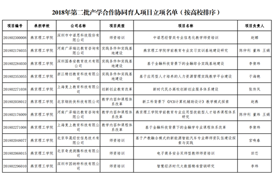 近日,教育部发布《教育部高等教育司关于公布有关企业支持的2018年第二批产学合作协同育人项目立项名单的函》(教高司函〔2019〕12号),燕京理工学院共有11个项目获批为2018年第二批产学合作协同育人项目立项,获批立项类别涵盖教学内容和课程体系改革、师资培训、实践条件和实践基地建设和创新创业教育改革四个方面。