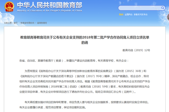 教育部发布《教育部高等教育司关于公布有关企业支持的2018年第二批产学合作协同育人项目立项名单的函》