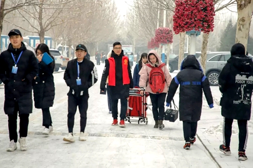 考试期间,学校青马工程培训班的500余名学员作为学生志愿者,为考生及家长提供了暖心志愿服务,同时,学校也为考生及家长提供了高品质的餐饮和住宿服务,为考生取得好成绩保驾护航。学校周到的服务得到了考生及家长的高度肯定,一位来自山西的考生家长激动地说:“燕京理工学院领导、老师和同学们给我们提供的热情服务,让我们在寒冷的冬天里感受到了家一般的温暖,非常感谢你们的付出,燕京理工学院给我们留下了非常好的印象!”