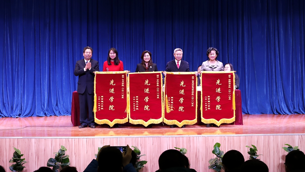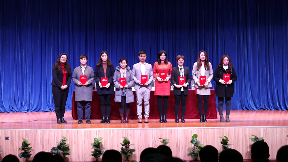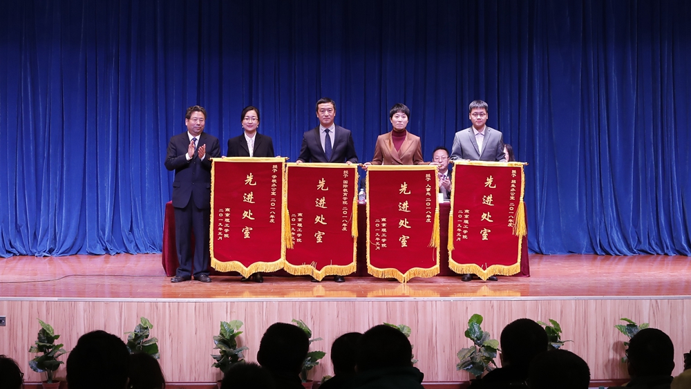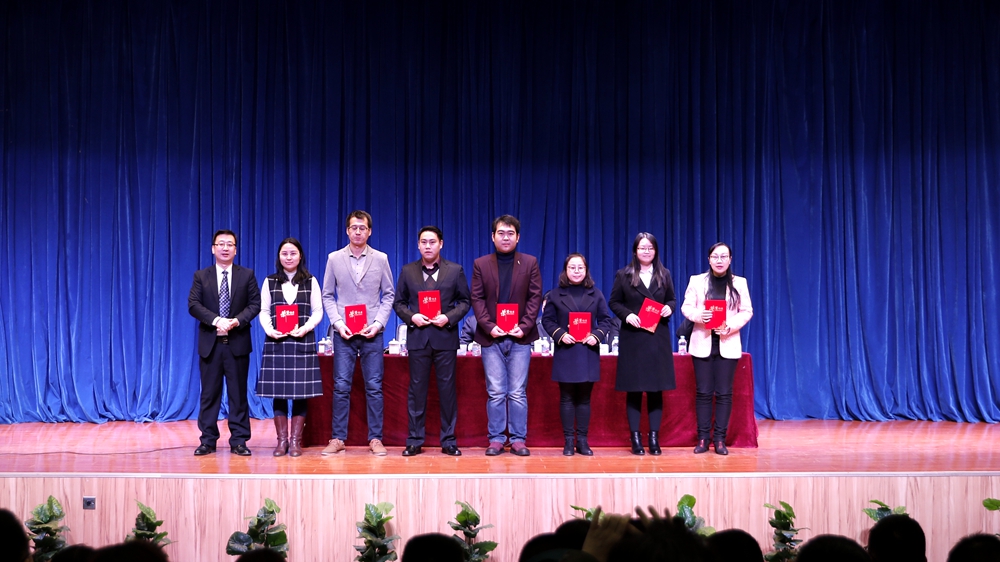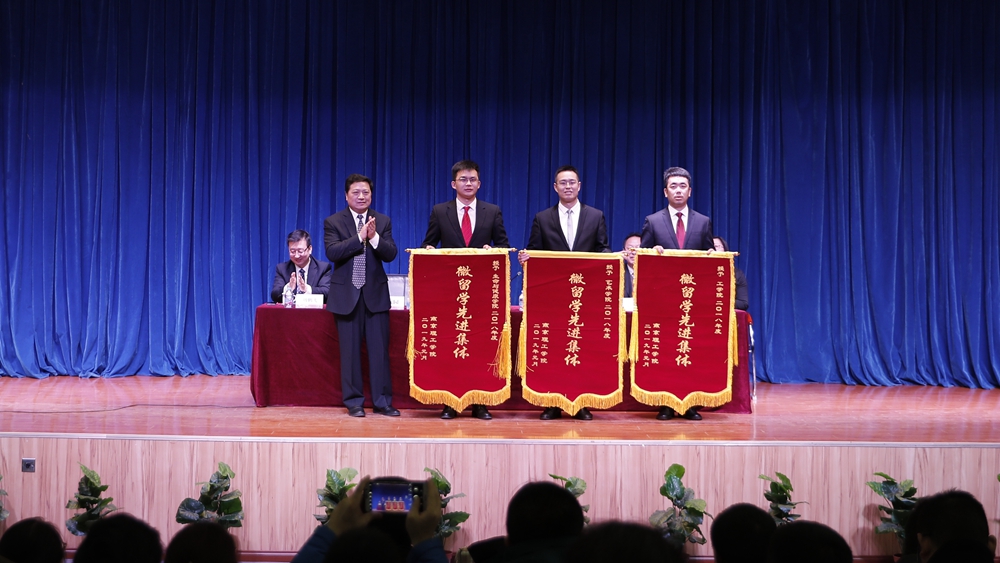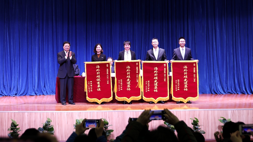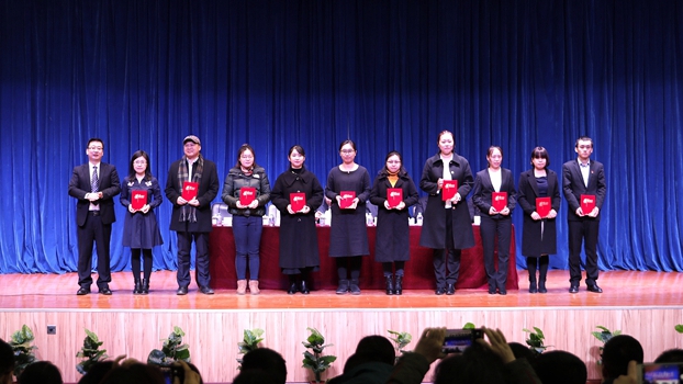 校党委书记李建英宣读2018年度先进集体和优秀个人的决定。大会表彰了先进学院和处室、特别贡献团队、忠诚敬业奖、创新奖、微留学和海外升硕先进集体、优秀干部、优秀教职工等13项目170个先进集体和优秀个人,与会领导分别为先进集体和优秀个人颁发奖状和锦旗,表彰他们为促进学校建设发展做出的贡献。先进处室代表、国际教育学院吴仲元现场分享了工作收获和感悟。