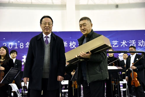 演奏期间,全场气氛活跃,我校师生在浓郁的艺术氛围里感受到了高雅艺术的魅力,陶冶了情操。活动最后,校党委书记李建英代表全校师生,向河北省交响乐乐团赠送我校创新创业孵化园学生的创业产品中国龙作为礼物。