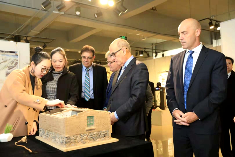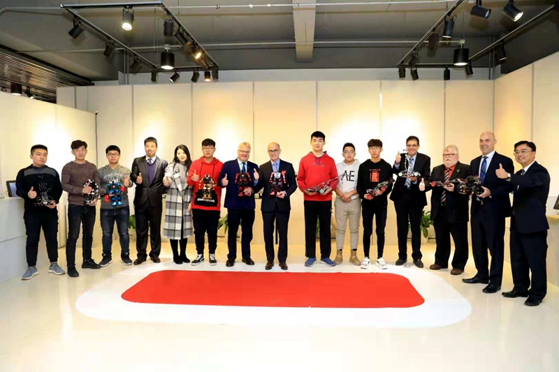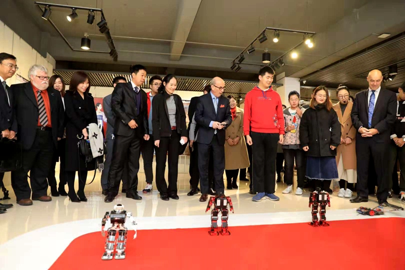 加拿大卡普顿大学校长团一行还参观了我校校史馆、智能汽车研究院学生作品展及艺术学院学生艺术设计作品展,并现场对第十届国际大学生时尚设计盛典的举办和智能汽车研究院学生未来发展做了寄语。在参观了我校学生自主研发的跳舞机器人、电磁智能小车等获奖作品后,大卫·查尔斯·丁沃尔博士表示,智能机器人行业发展潜力无限,希望同学们用兴趣激发潜力,在未来取得更大进步。在中国传统剪纸展示区,我校剪纸社社长马劭文同学为校长团一行展示了中国传统剪纸画的创作过程,并将自己的剪纸作品赠予了来访校长团,浓厚的民族传统文化氛围和充满创意的艺术作品给校长们留下了深刻印象。