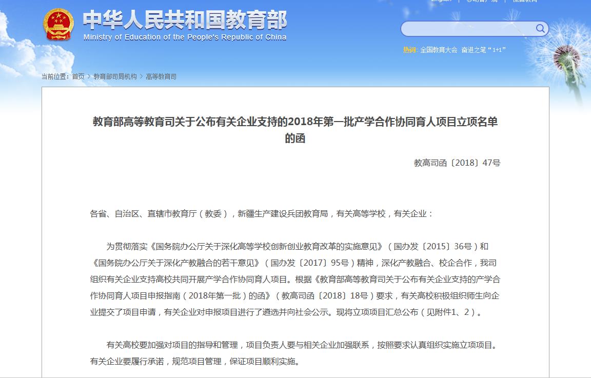 教育部推出的“产学合作协同育人项目”,是为贯彻落实《国务院办公厅关于深化高等学校创新创业教育改革的实施意见》(国办发〔2015〕36号)和《国务院办公厅关于深化产教融合的若干意见》(国办发〔2017〕95号)文件精神,由教育部组织并指导有关企业支持高校共同开展产学合作协同育人项目,旨在深化产教融合、校企合作,创新产学合作协同育人机制和高校人才培养机制。