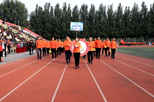 开幕式上,文法学院教师屈美丽作为裁判员代表宣誓,全体裁判员将会严格按照规程裁判,做到公平、公正;文法学院李岩同学代表运动员宣誓,全体运动员会本着“友谊第一,比赛第二”的精神,赛出水平,赛出风格。各二级学院按照入场顺序带来了精彩纷呈的文体表演,为本届运动会献礼。充满青春气息的舞蹈和活力四射的啦啦操表演展示了同学们昂扬向上的精神面貌。