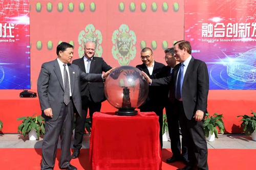 与会领导嘉宾共同触摸启动球,中国第一家校企联合的智能汽车研究院正式成立