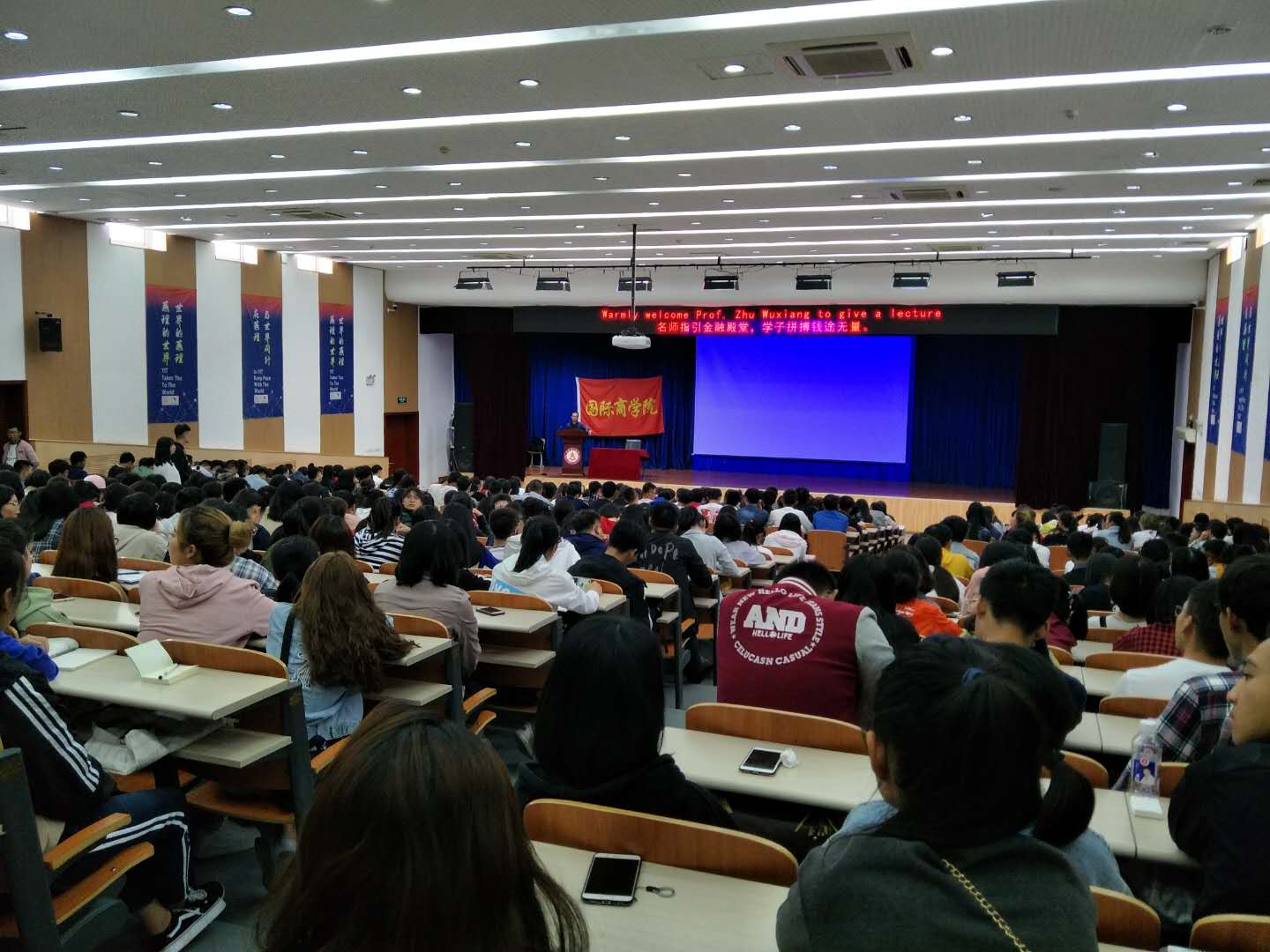 随后,朱教授从新商业时代的角度出发,向国际商院学子展示了现代社会背景下的新经济模式,并通过大量的数字与图片使同学们更好的理解“数字化改造”的理论方法。面对国际商学院学子提出的在新经济巨大冲击下传统行业应如何崛起的问题,朱武祥教授说:“面对新经济的冲击,对传统行业既是挑战,又是机遇,应通过探索客户需求,市场细分等方面,进而实现行业自身价值的翻盘。”朱武祥教授热情洋溢的讲座,引来一阵阵的掌声,为国际商学院2018级新生打开了创新思维的“大门”。