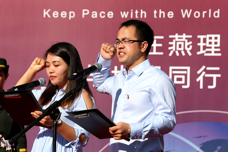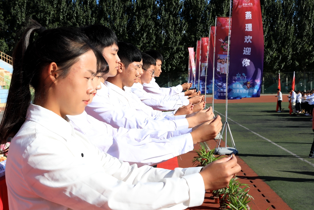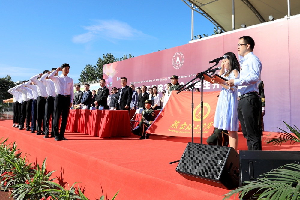 最后,2018级全体新生面向校旗光荣宣誓:作为燕京理工学院学生,秉承校训,勤奋创新璞玉成器;尊师重道,坚守初心,锤炼品格;争做会学习、会做事、会做人、会与人共处,有感恩之心、有博大胸怀、有吃苦精神、有创新意识、有创业能力的社会精英、时代新人;追求卓越进步,励志青春报国,担当时代责任,肩负伟大使命,献身民族复兴!