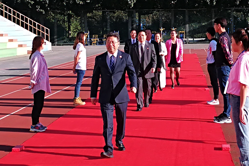 典礼在雄壮的《中华人民共和国国歌》声中拉开帷幕,全体师生面向国旗唱国歌。