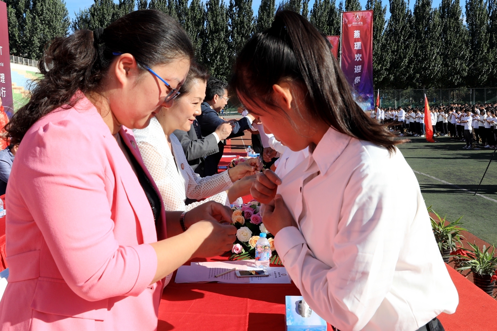 典礼现场,学校领导为新生代表佩戴校徽,6100多名新同学以求知之心、敬畏之心佩戴校徽。校徽是学校的品牌标识和文化积淀,一枚闪亮的校徽,承载着一代代燕理人的挚爱和情怀,将记录着同学们大学四年的成长成才,成为同学们大学生涯中最为珍贵的纪念。