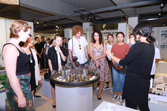 在艺术展厅,来自加拿大的9位艺术家参观了艺术作品展,与学生们交流艺术创作。展品包含了学校服装与服饰设计、视觉传达设计、环境艺术设计、产品设计等专业学生的毕业作品,以及历届国际大学生时尚设计盛典中的部分获奖作品,展现了中外大学生在艺术、设计领域的专业造诣和不懈追求。