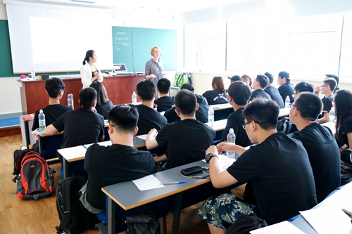 当天上午,Ann老师给同学们带来了精彩的课程。她地道的英语和开放式的教育理念给同学们留下了深刻的印象。课程主要内容是Teamwork,Ann老师精心设计了课程小组合作与互动等环节,课堂上同学们积极思考问题,积极与老师互动。结课时每个小组展示了各自小组团队合作的创新成果,Ann老师充分肯定了同学们的创新能力和外语水平。